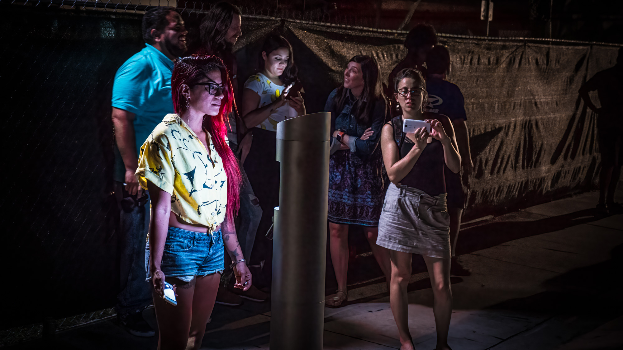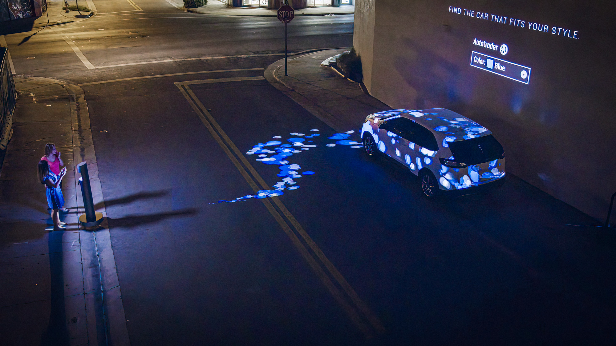 To promote Auto Trader’s search by colour website functionality, we set up an installation in the fashionable Wynwood Arts District of Miami, USA. People’s clothing was scanned and detected before the colours were projected across the street and onto a parked car opposite. A pillar on the sidewalk contained a sonar detector to sense that someone was in front of it. As attendees approached, a ring of LEDs animated in a sequence to illustrate to the user that they had triggered something and were about to be scanned. The sequence resulted in a bright white ring and a HD camera captured imagery of the clothing. The images were quickly analysed and up to 5 dominant colours were automatically picked. These colours were then used to fill separate matte layers of animation within our server which were subsequently projected upon the street. The motion graphics travelled towards the car and engulfed it, changing the vehicle’s paintwork to be the dominant colour. Brand messaging appeared and after enough time for a photo, the colour transitioned out, back onto the street.